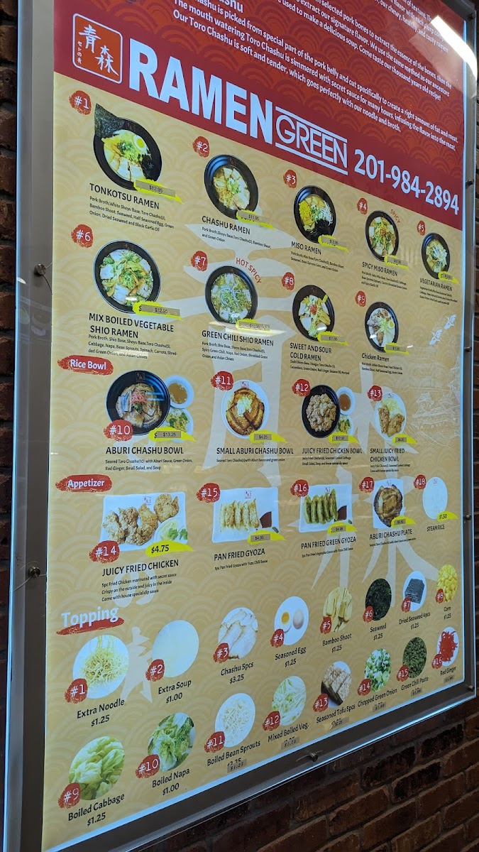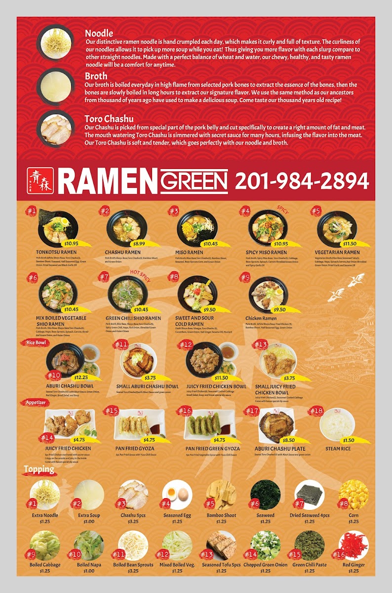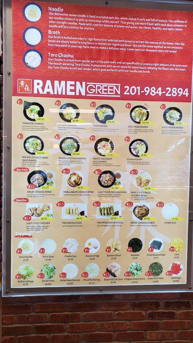 Ramen Green in Jersey City offers a delightful and varied menu that is sure to satisfy any craving for Japanese comfort food. Their ramen selection includes classics like Tonkotsu Ramen and Chashu Ramen, with a bold Spicy Miso Ramen for those seeking a little heat, and a Vegetarian Ramen for a plant-based option. For rice bowl lovers, choices like the flavorful Aburi Chashu Bowl and the crispy Juicy Fried Chicken Bowl are standouts, with the Japanese Curry Chicken Bowl providing a warming alternative. Appetizers are equally enticing, featuring dishes like the crispy Juicy Fried Chicken, savory Pan Fried Gyoza, and the unique Aburi Chashu Plate. If you're in the mood for something grilled, their Teriyaki options, including Teriyaki Chicken, Teriyaki Shrimp, and Teriyaki Salmon, offer rich flavors that pair perfectly with any meal. The combo options, like Combo1 T&M and Teriyaki Combo, give diners the chance to try a variety of dishes in one meal, while sides like SIDE Egg and SIDE Chashu allow for personal customization. To complete the meal, refreshing drinks such as Green Tea and Calpico are available. Whether you're in the mood for a hearty ramen bowl or a savory rice dish, Ramen Green delivers a well-rounded dining experience that brings comfort and flavor to every bite.
